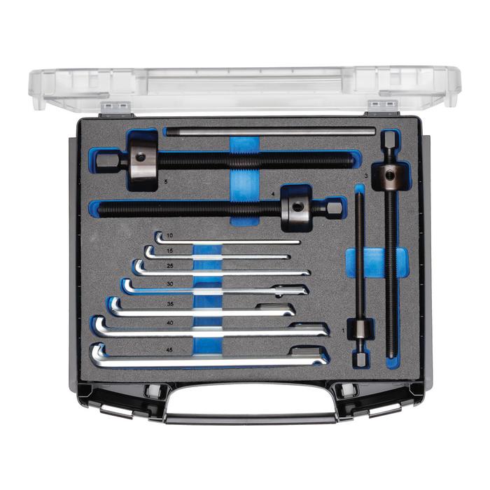 Kugellagerabzieher-Satz für über 40 Kugellager, Zum Abziehen von Kugellagern, die auf einer Welle und zugleich in einem Gehäuse sitzen, Zerstörungsfreies Abziehen von Rillenkugellagern ohne Ausbau der Welle, kein Aufbohren des Lagerkäfigs notwendig (spänefrei), Mit Check-Tool-Einlage für das schnelle Erkennen von fehlendem Werkzeug, Einlage in Schubladen mit den Mindestmaßen 340 x 260 x 60 mm verwendbar