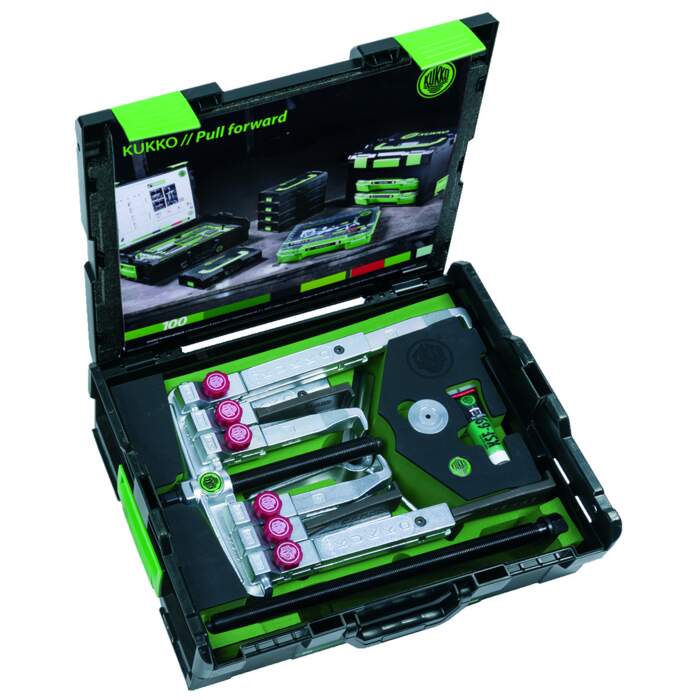The 2- and 3-arm universal puller set with two different types of pullers is used for universal work when pulling off gear wheels, bearings, pinions and synchronous bodies. This set contains the basic set of pullers needed for universal work.