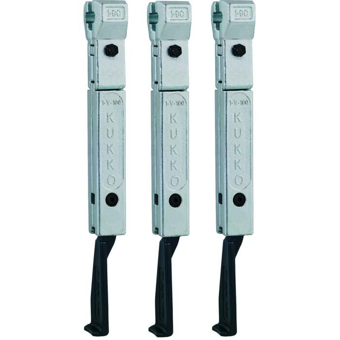 The set of three extremely narrow pullers is suitable for 3-arm universal pullers. The trapezoidal contact surface of the claw ensures that even very narrow and poorly accessible gaps can be reached