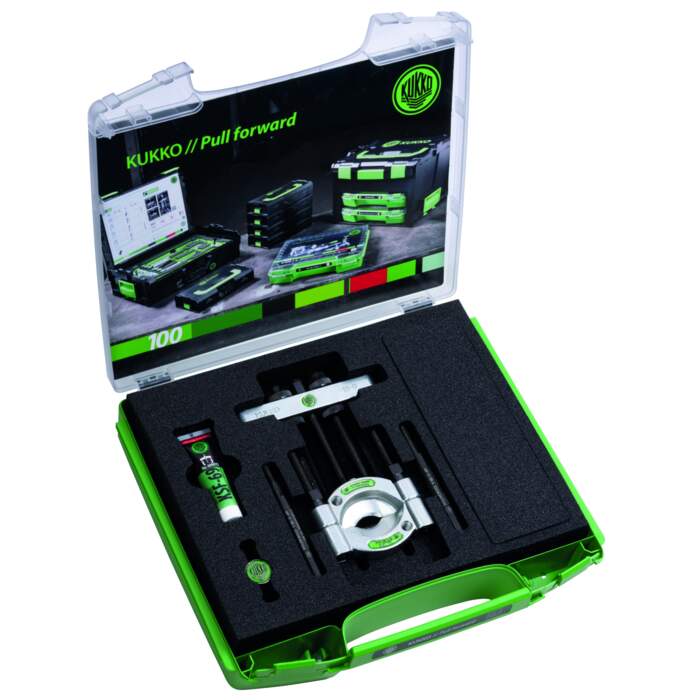 The separator sets are used to pull off ball bearings, roller bearings, inner rings and other parts that lie flat when there is not enough space for pull-off hooks. The separator-puller process gently separates those parts before they can be pulled off from the outside.