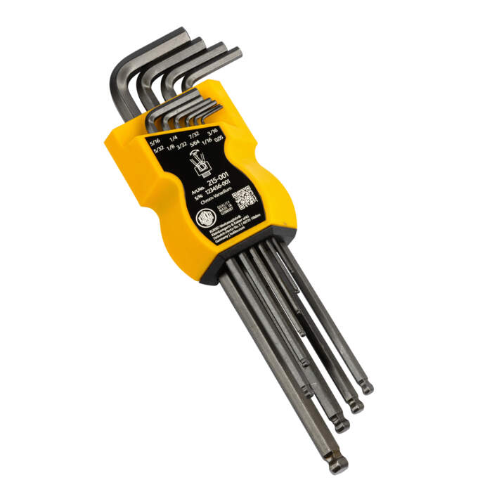 The angled screwdrivers with ball end in the clip of the 215 series are used for operating screw heads that are difficult to access. Hardness and torque correspond to the ISO standard. They are inexpensive and compact, and housed in a lockable, impact-resistant plastic case.