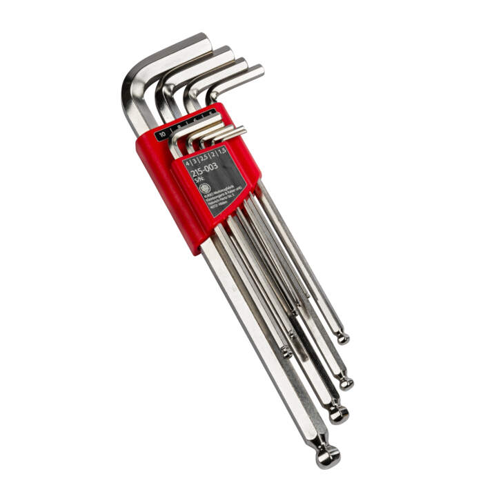 The angled screwdrivers with ball end in the clip of the 215 series are used for operating screw heads that are difficult to access. Hardness and torque correspond to the ISO standard. They are inexpensive and compact, and housed in a lockable, impact-resistant plastic case.