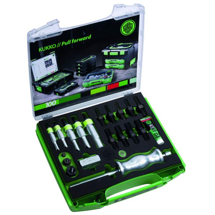 The slide hammer sets for extracting ball bearings and dowel pins of the 28 series are used for non-contact extraction of internal bearings, bearing outer rings and bushes as well as components with threads. Sliding hammer and thread inserts are included in the set for the application.
