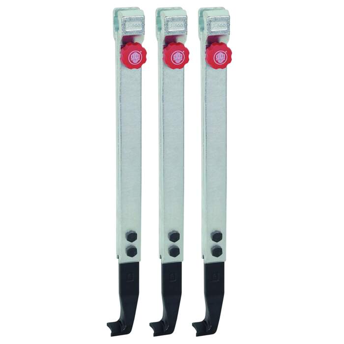 The set of three narrow, quickly adjustable trigger hooks is suitable for 3-arm universal pullers. The narrow pullers ensure that even narrow and poorly accessible gaps can be reached.