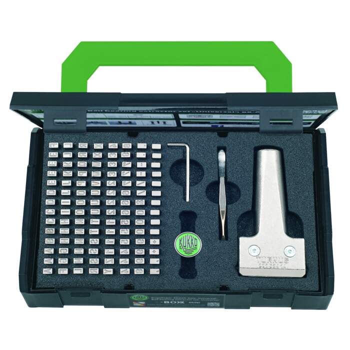 The type holder set of the 333 series is used for multi-digit engraving in industry. The set has a hardness at the engraving between 58 and 60 HRC. The nickel-plated surface leaves no extraneous rust and is particularly suitable for marking stainless steel.