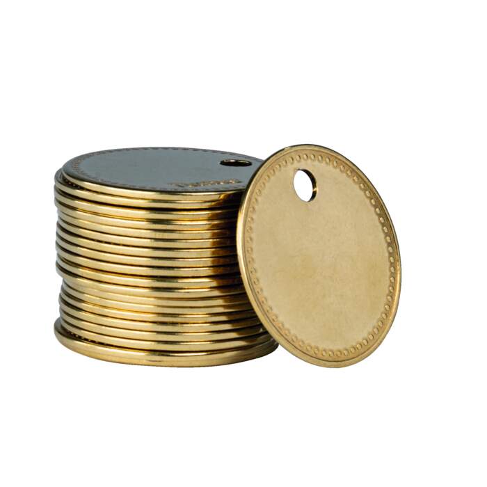 The 334 series tool marks are used for marking and identifying tools. Made of brass or aluminium, the tool marks have an embossed beaded edge and a hole for connection to the workpiece to be marked. Can be individually inscribed on request.