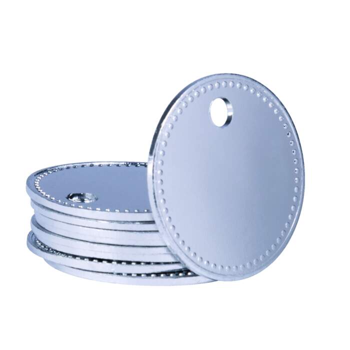 The 334 series tool marks are used for marking and identifying tools. Made of brass or aluminium, the tool marks have an embossed beaded edge and a hole for connection to the workpiece to be marked. Can be individually inscribed on request.