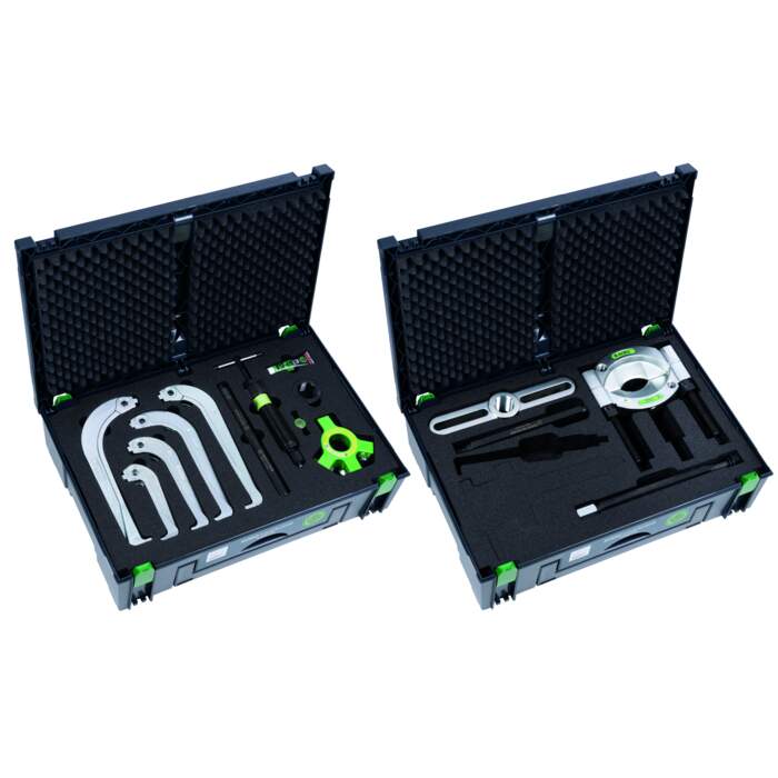 The hydraulic universal puller set with separator and self-centring puller hooks is used for pulling off and separating bearings, gears, washers etc. As a set of the 800 series, it enables a wide range of hydraulic extraction options while maintaining modularity.