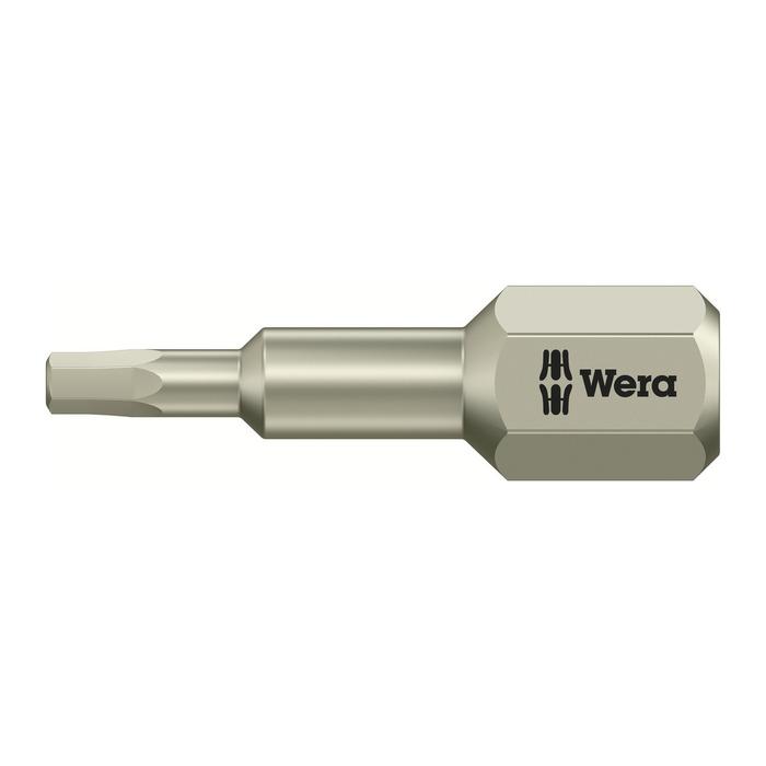 High quality bits out of stainless steel for hexagon socket screws. Wera stainless are made out of stainless steel which prevents the formation of unsightly extraneous rust. The Hex-Plus profile offers a greater contact surface in the head of the screw. The notching effect is therefore reduced to a minimum and damage to the screw head more or less eliminated. Come with Torsion zone: Torsion bits take-up torque peaks and absorb them in the Torsion zone. This prevents premature wear and extends the service life of the bit. 1/4" hexagon, suitable for holders as per DIN ISO 1173-D 6.3.